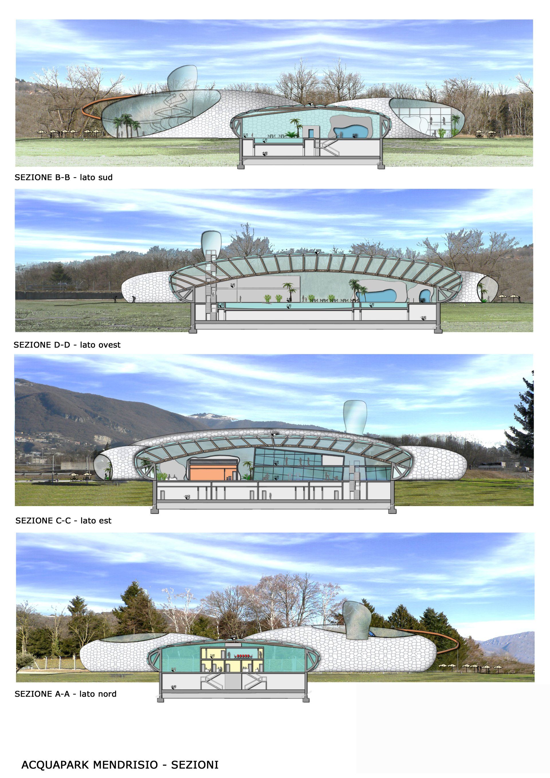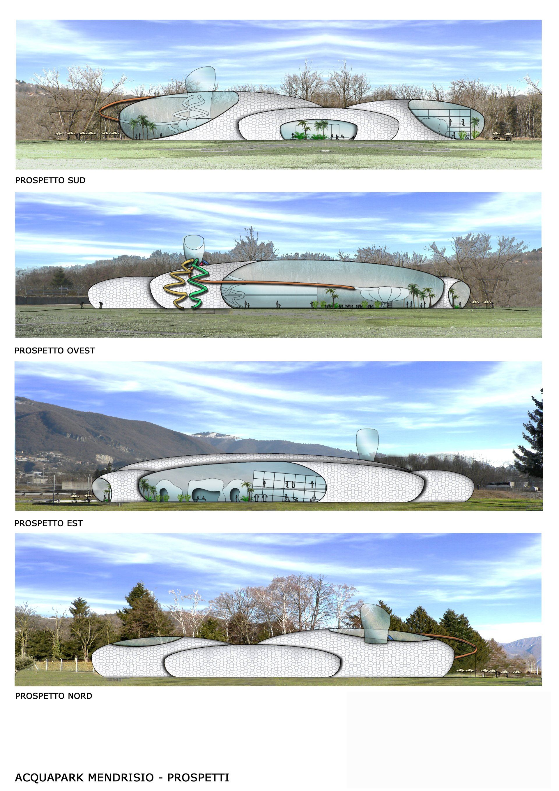 Concept per il progetto di un Acquapark a Mendrisio. Si tratta di un progetto che prevede l'utilizzo di materiali innovativi: legno lamellare per la struttura, plastica ETFE per la copertura e con arredi a bassa emissione di formaldeide. E' un edificio studiato tenendo conto dell'orientamento e la struttura non è pensata solo per le attività quotidiane ma anche per manifestazioni sportive (nuoto agonistico/ fitness / pallanuoto ecc.). Per questo sono state pensate, al piano superiore, anche delle aule didattiche o sale meeting, per le eventuali manifestazioni.