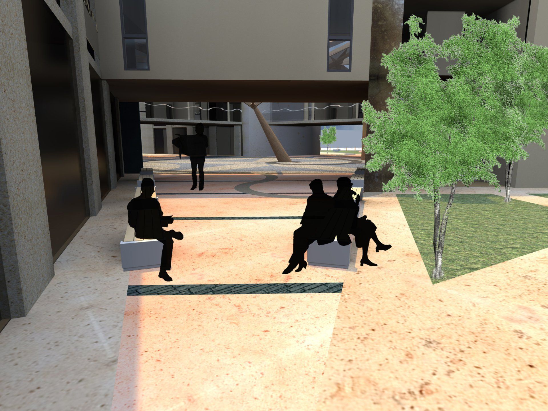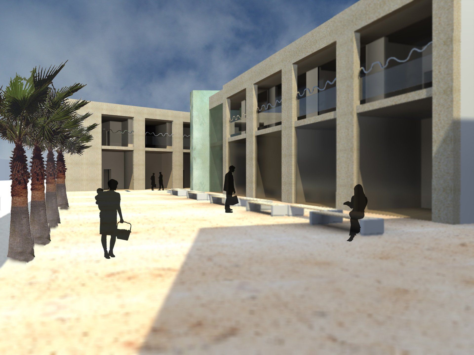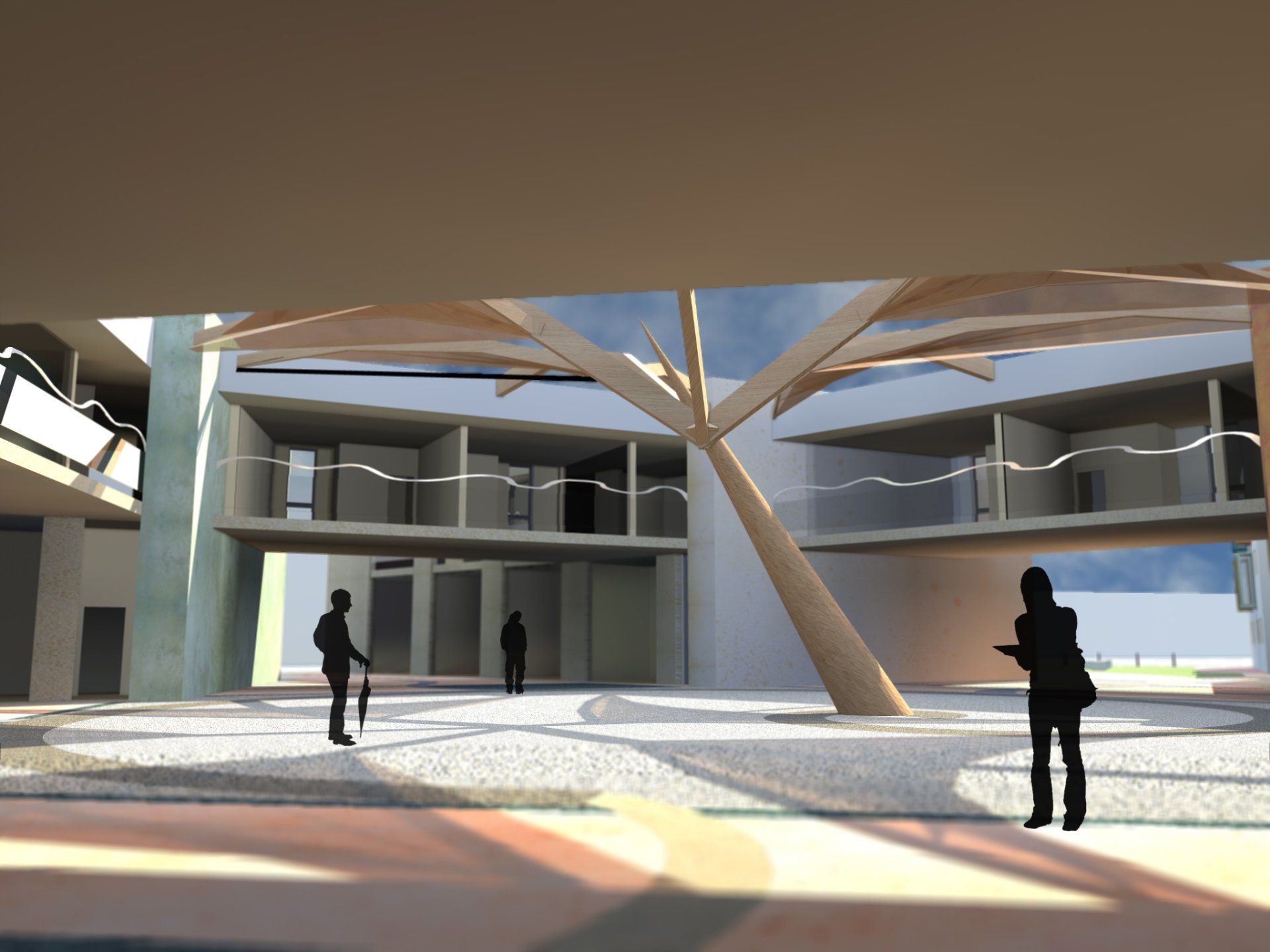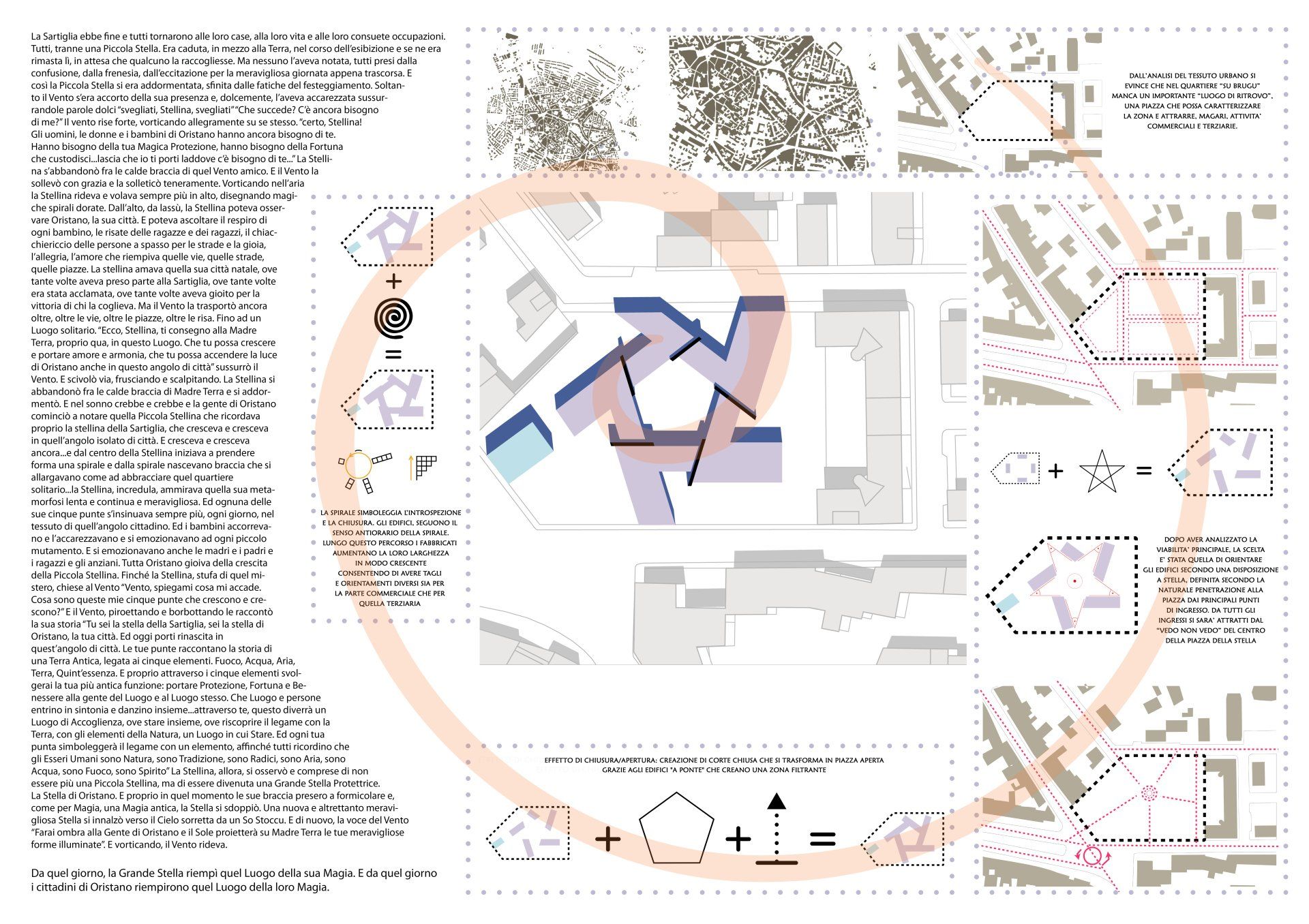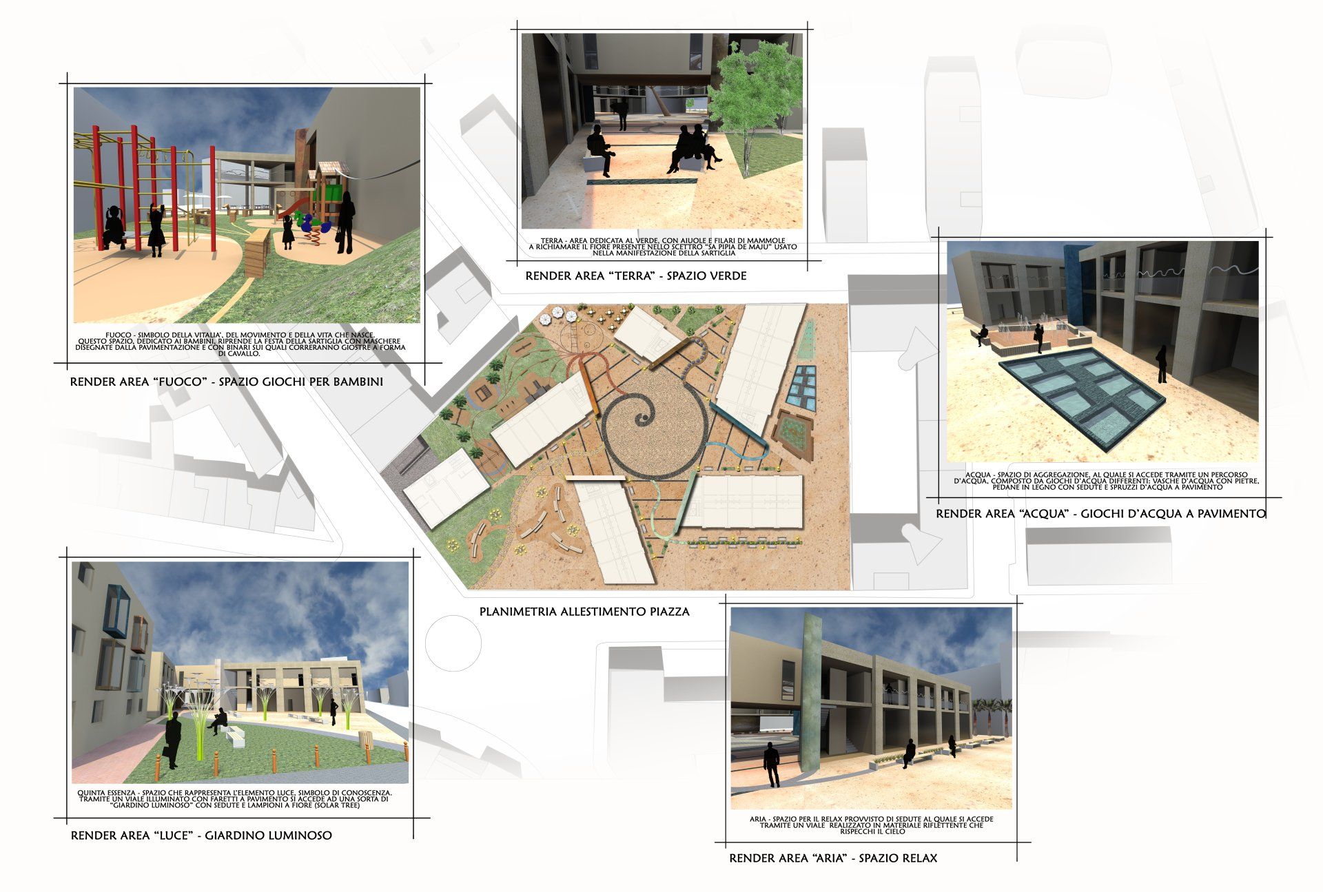 L'idea del progetto nasce da una profonda analisi del tessuto urbano e della viabilità principale del luogo. La scelta è stata quella di orientare gli edifici secondo una disposizione a stella, definita secondo una naturale penetrazione alla piazza dai principali punti di ingresso. I materiali pensati per le diverse aree della piazza si rifanno ai 4 elementi naturali: Aria, Acqua, Terra e Fuoco più la quinta essenza rappresentata dalla Luce.