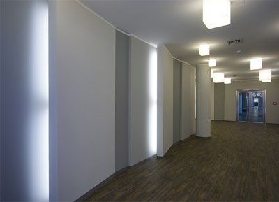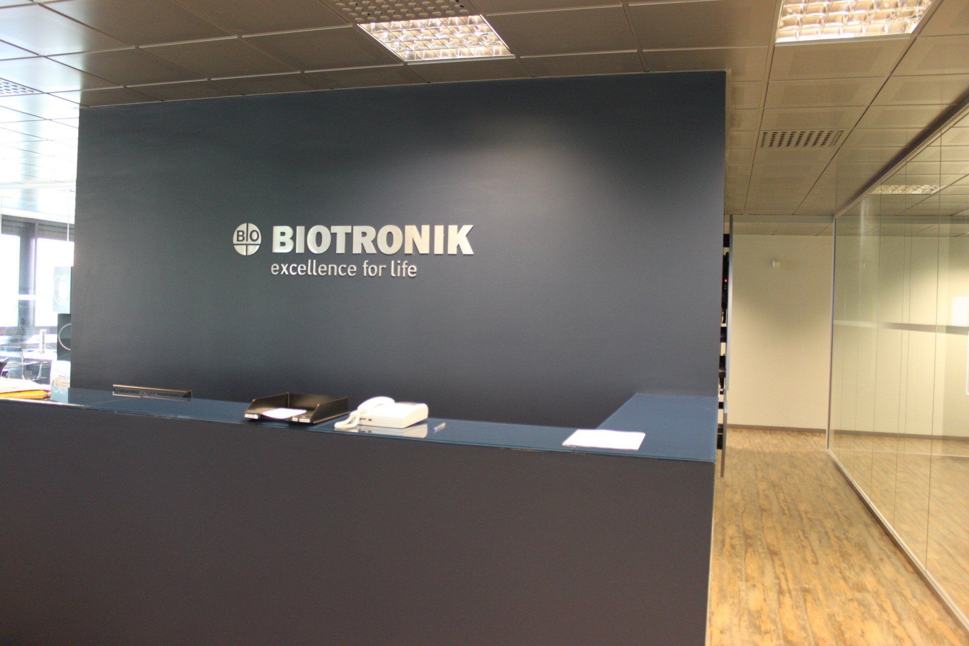 Il progetto degli uffici prevede di dare la massima importanza alla unitarietà tra i vari spazi costituenti l’ambiente ufficio. Infatti, la scelta di racchiudere gli uffici dirigenziali entro pareti mobili vetrate a tutt’altezza conferisce allo spazio una sensazione di continuità con la zona ad open space. Gli unici spazi racchiusi tra pareti opache sono la sala conference e l’area coffee, che necessitano di maggiore privacy e vanno celate agli sguardi. Infine trattandosi della sede italiana di un’importante azienda, è stata data evidenza al logo aziendale. In una prima ipotesi era stato proposto un gioco architettonico di pareti aggettanti e rientranti. La seconda soluzione, invece, che è stata poi realizzata, è quella di un grosso cubo all'ingresso, che cela lateralmente il bancone reception, con il logo Biotronik. Dal logo parte un neon LED incassato a parete, intervallato da monitor per la proiezione di video sui pacemaker (prodotto dell'azienda) e che culmina con una teca per l'esposizione del prodotto stesso.