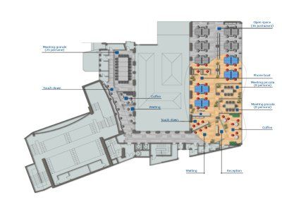 Nel progetto degli uffici si è tenuto conto delle diverse esigenze delle varie figure di lavoratori. Lo spazio è stato studiato in base alle differenti attività lavorative: aree ad open space si alternano a spazi chiusi che ospitano sale meeting di diversa capienza. Alcune cabine Phone Boot permettono ai lavoratori di compiere telefonate che necessitano di maggiore privacy. Per supplire, in alcuni particolari momenti, alla maggiore richiesta di postazioni computer, si sono previste aree a Touch Down, con postazioni dedicate. La zona di attesa, sia per quanto riguarda il piano 1° che il 6° si compenetra nella zona Coffee attrezzata.