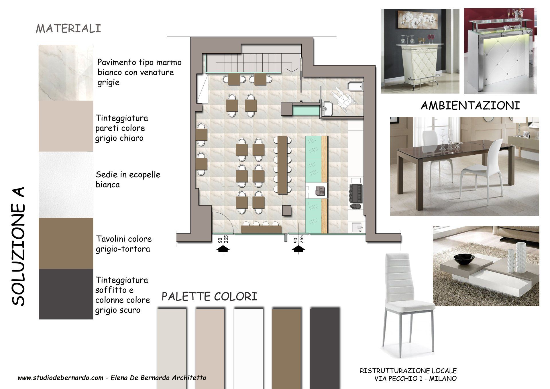 Ristrutturazione di un bar/tavola fredda a Milano. Il progetto finale è nato dall'unione di due proposte progettuali presentate al cliente. Il risultato è la contrapposizione tra un ambiente quasi totalmente bianco (pareti, arredo e pavimentazione) e le colonne e il corpo scale rifinite con pittura effetto Cor-Ten. I corpi illuminanti, in stile classico al piano superiore e in stile più moderno al piano interrato, completano il progetto.